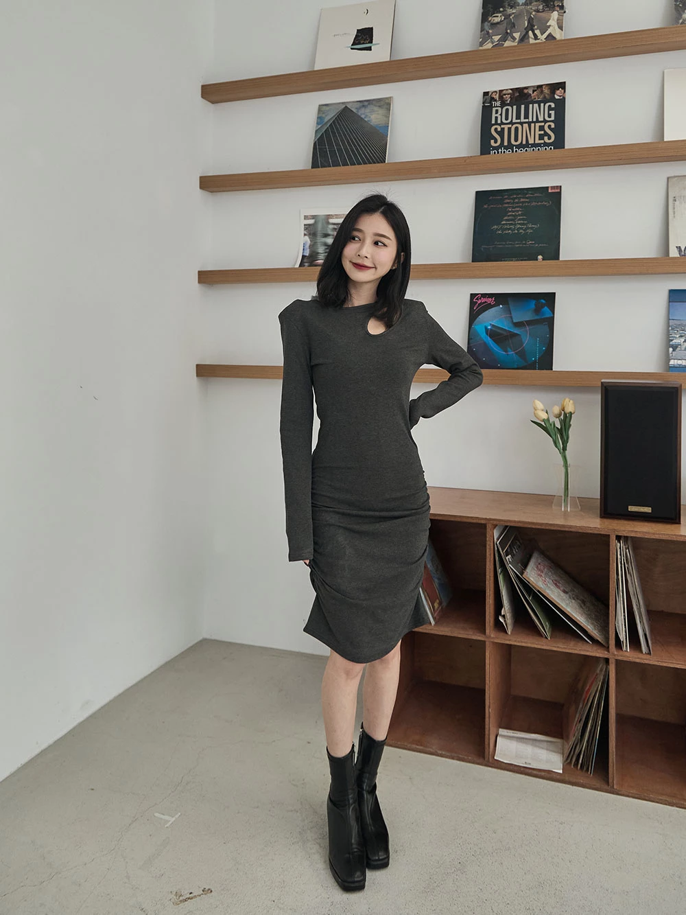 斜挖空墊肩抓皺洋裝