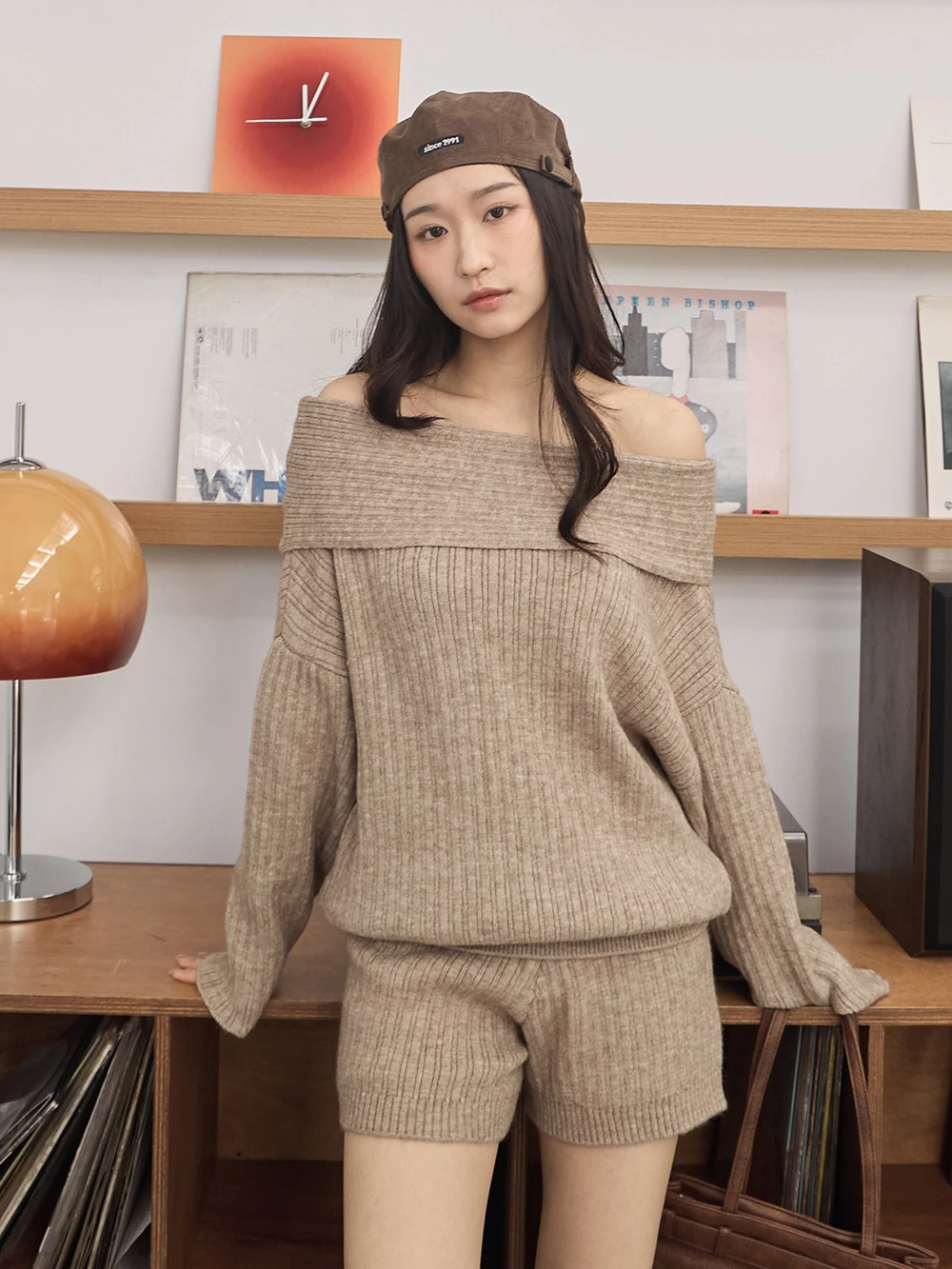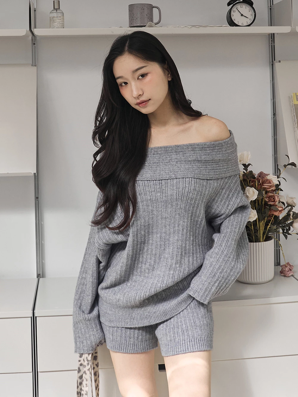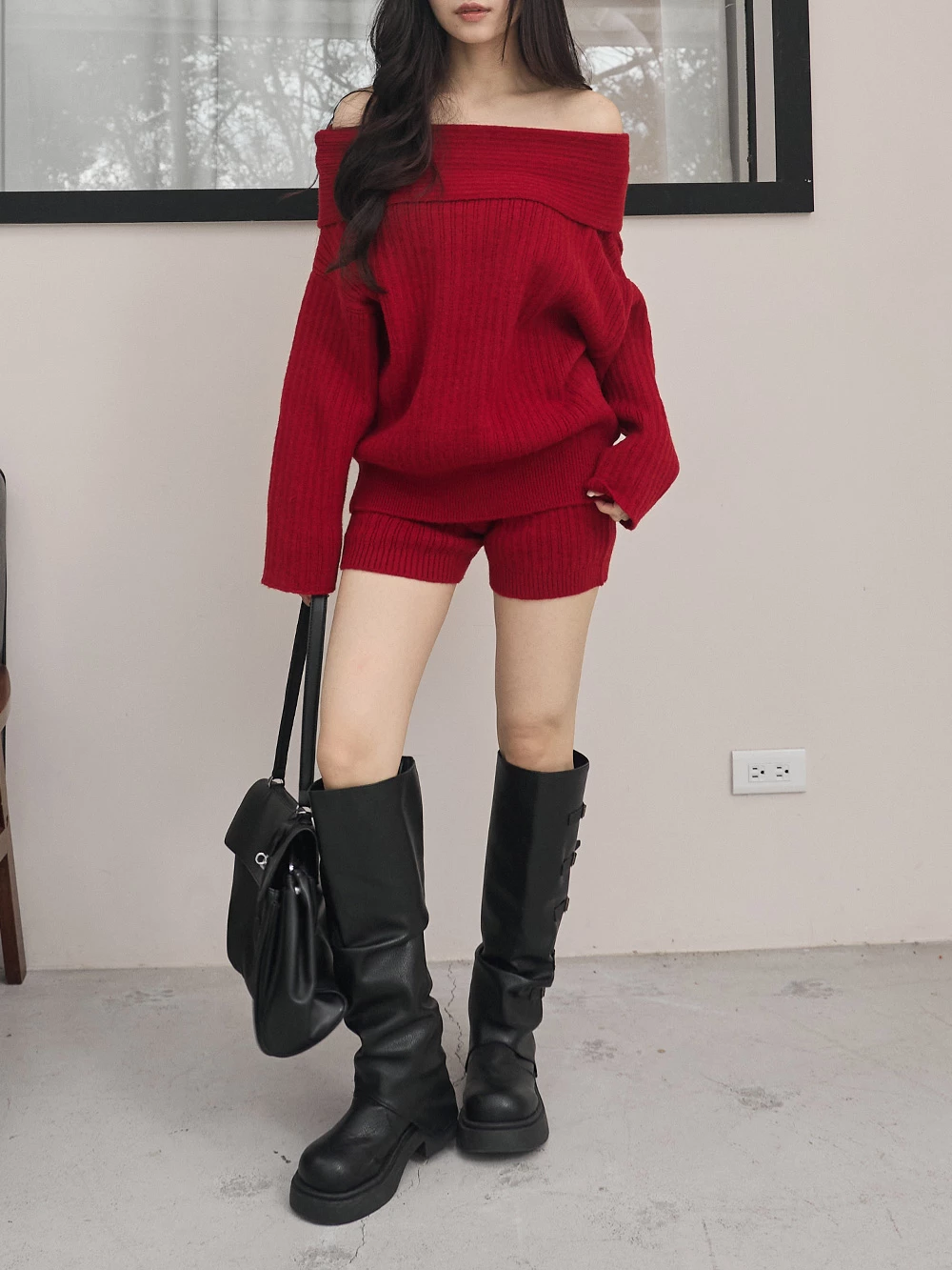 兩件式-一字領針織上衣+短褲