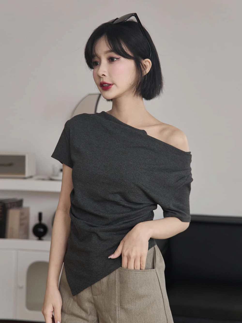 不對稱下擺彈性垂領上衣
