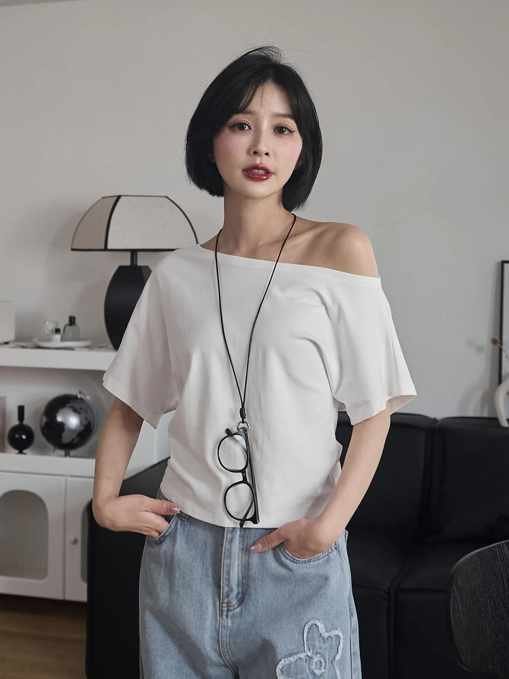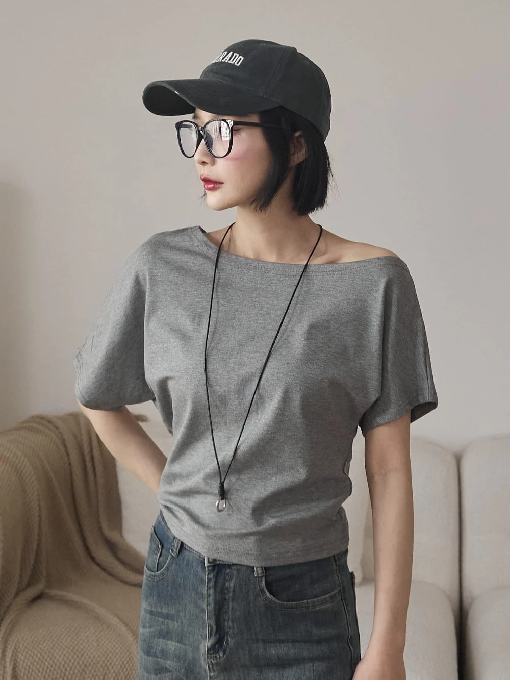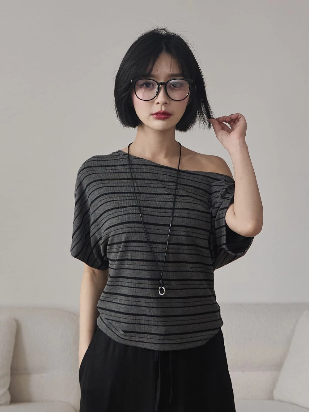 寬領斜肩彈性短袖上衣-附眼鏡項鍊