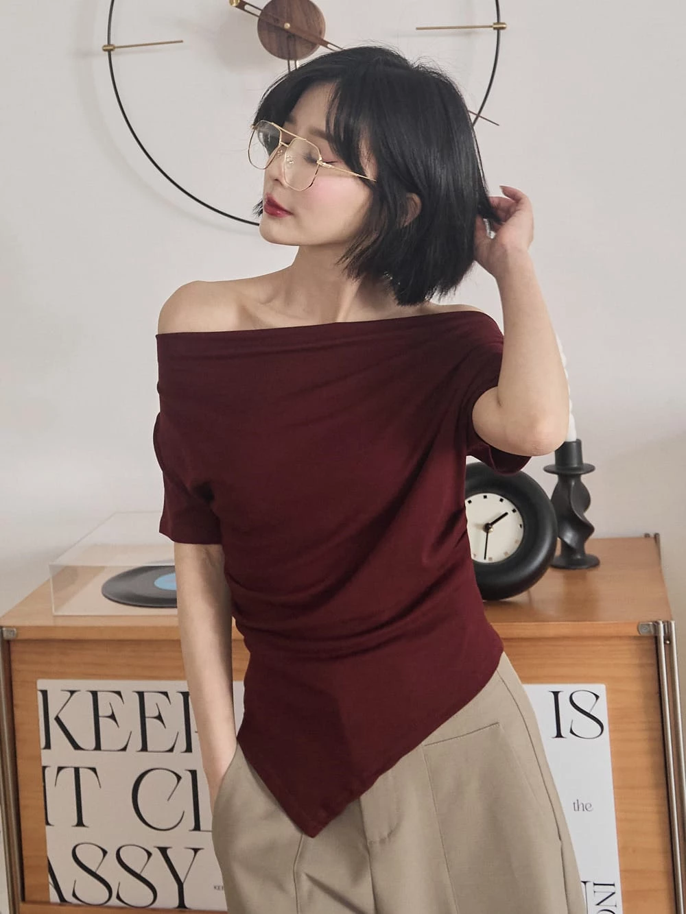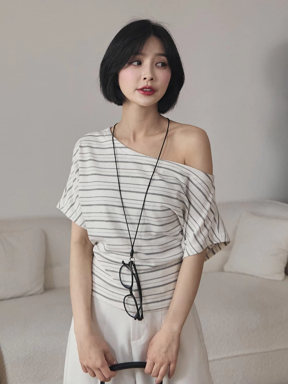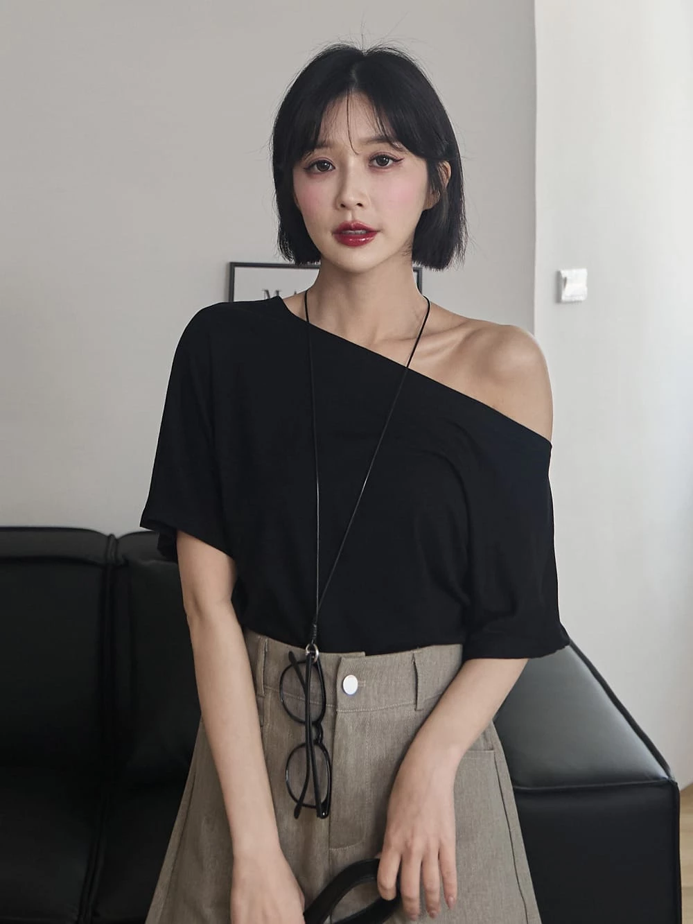 寬領斜肩彈性短袖上衣-附眼鏡項鍊