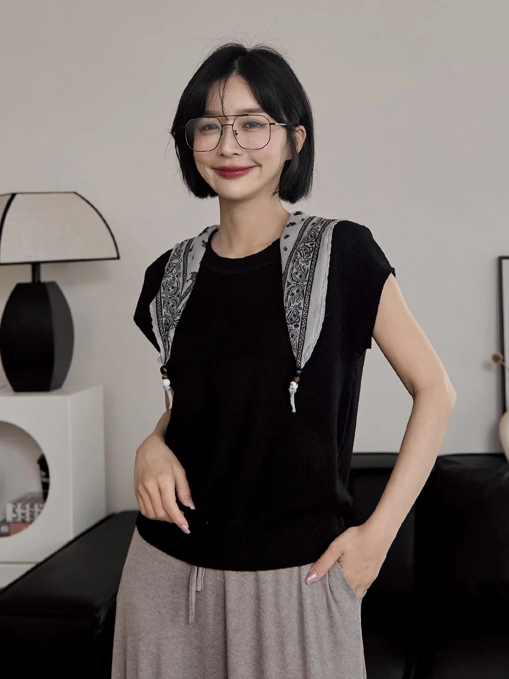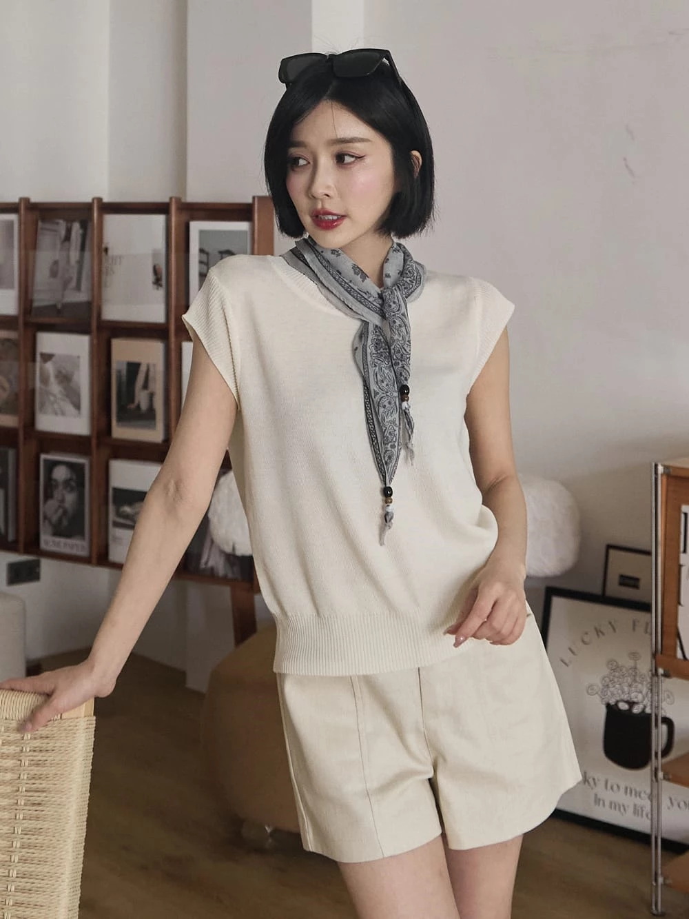 針織落肩短袖上衣-附絲巾
