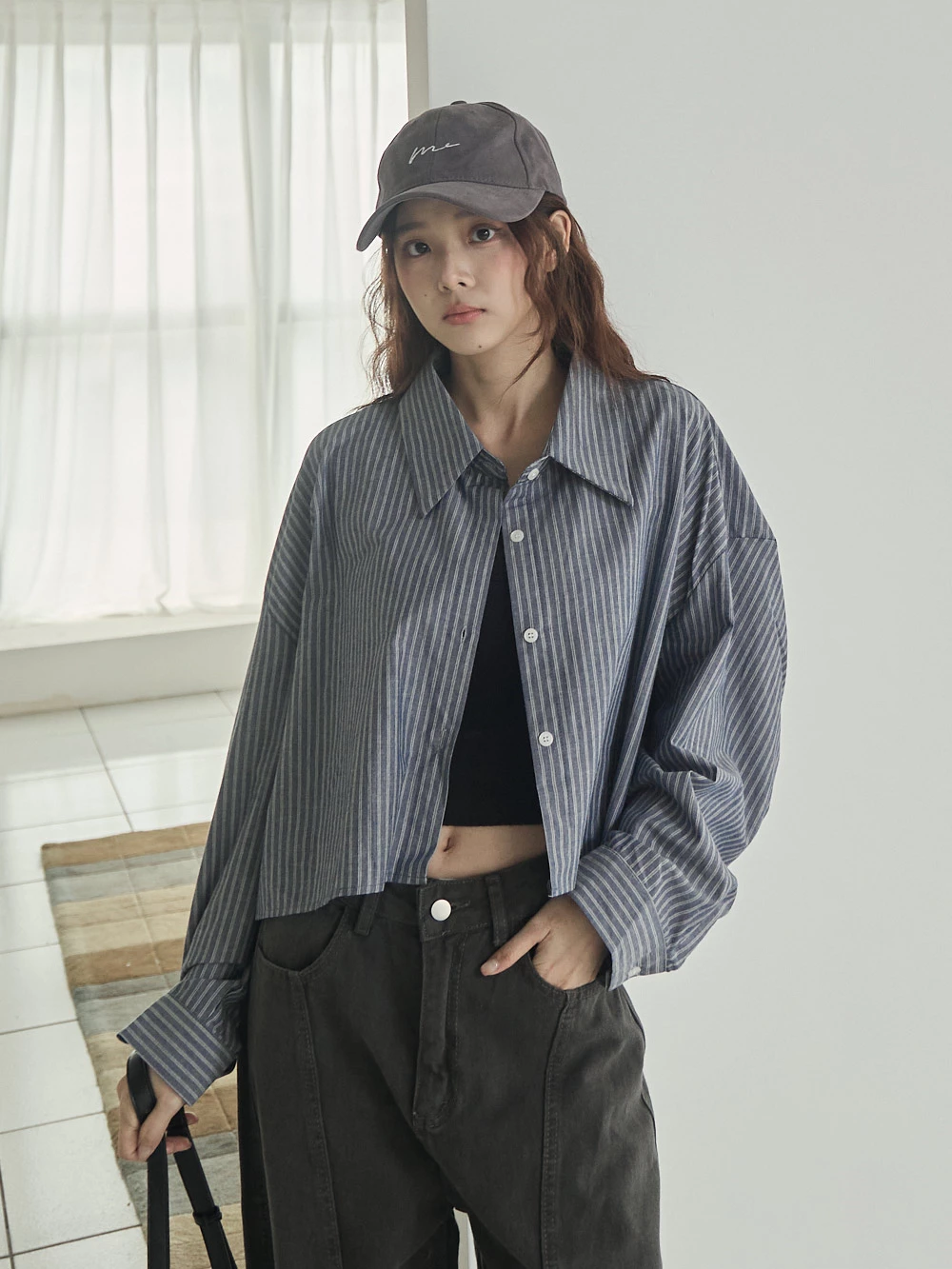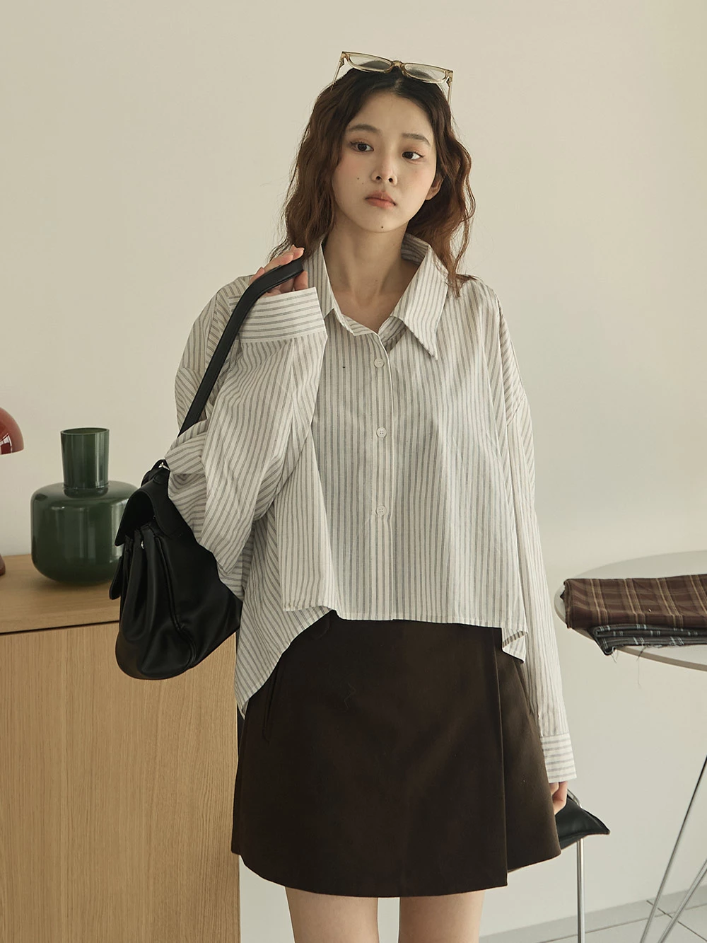 排釦寬鬆短版條紋襯衫